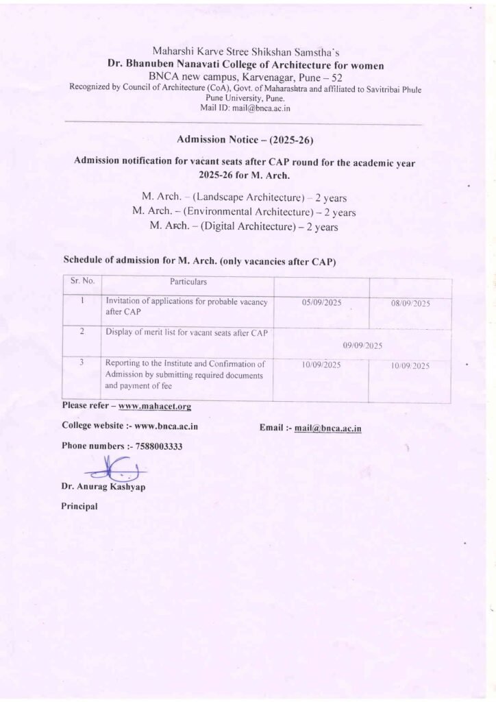 Admission Notification for vacant seats after CAP round for the academic year 2025-26 for M.arch